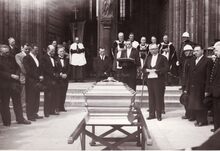 De lijkbaar staat opgesteld aan de inkom van de Sint Petrus en Pauluskerk. Centraal achter de lijkkist burgemeester Henri Serruys. Uiterst rechts staat een dominee en naast hem Robert Elleboudt. Op de achtergrond het Zeemanshuis met het Aquarium.
