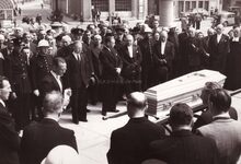 Burgemeester Henri Serruys houdt een toespraak bij de begrafenis van Alphonsus Maria Josephus Elleboudt aan de Sint Petrus en Pauluskerk. Schuin achter de burgemeester, staat Jan Piers met het kussen met de eretekens. Links van hem, begrafenisondernemer Willy Lucas. Links in het portaal, koster Brys, rechts hoofdcelebrant Karel Martens. De politieagenten droegen toen nog hun witte helmen.