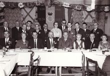 De tafel met de notabelen bij een feest van het Rode Kruis.Van links naar rechts Kamiel DEHOUCK, schepen, Roger DEKINDER, schepen,Jan PIERS, burgemeester, onbekend, onbekend, Henri EDEBAU,schepen, onbekend, onbekend.(Zie ook 2012/0195)