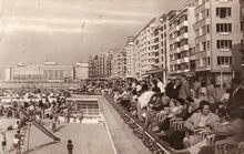 Strandrecreatie op het Groot Strand nabij de badinstallaties onder de Albert I-promenade. Op de achtergrond, de westgevel van het vierde Kursaal.