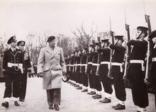 Veldmaarschalk Montgomery schouwt de erewacht van de Zeemacht, opgesteld op het Canadaplein voor het dienstdoend stadhuis (Gerechtshof). Links achter Montgomery, commodore Georges Timmermans, toen stafchef van onze Zeemacht. Op de achtergrond het Leopoldpark.