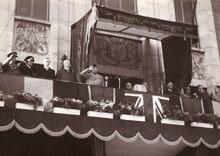 Veldmaarschalk MONTGOMERY spreekt de menigte toe van op het balkon van het dienstdoend stadhuis (Gerechtshof) tijdens zijn eerste bezoek aan Oostende. Naast hem schepen Emiel VROOME. Achter hen schepen Roger DE KINDER. Voor hem het schrijn versierd met Oostendse motieven, waarin de oorkonde van het ereburgerschap van de Stad Oostende.