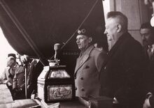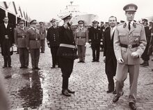 Inhuldiging van het Montgomery dok en onthulling van de gedenkzuil. Eerste schepen Emiel VROOME geeft tekst en uitleg over de gedenkzuil dat bij het bezoek van veldmaarschalk MONTGOMERY aan onze stad ingehuldigd werd. Achter de schepen, stadsbode Henri LANNOYE.