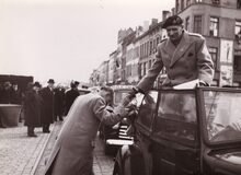 Veldmaarschalk MONTGOMERY wordt begroet op de Visserskaai, ter hoogte van het Vissersplein, tijdens zijn eerste bezoek aan Oostende.