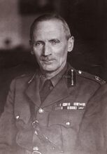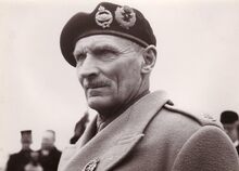 Close up van veldmaarschalk Montgomery tijdens zijn bezoek aan Oostende. Op de achtergrond franse officieren.