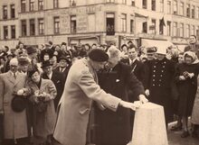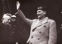 Veldmaarschalk MONTGOMERY groet het publiek tijdens zijn eerste bezoek aan Oostende. Links van hem schepen Emiel VROOME.