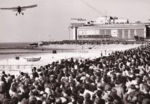 Demonstratie door een licht vliegtuigje op de "Dag van de Luchtmacht" aan het Groot Strand nabij de Kursaal , gelegen langs de Albert I-promenade (Petit Nice) in de zomer van 1954. Mooi weer en een zee van volk. Centraal op het strand een roeiboot toen gebruikt door de reddingsdienst.