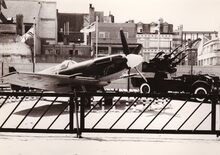 Luchtmacht materiaal tentoon gesteld op toen nog braakliggende grond (terrein vernielde gebouwen W.O. II) omgeving Kapelle- en Ooststraat.Het huis op de achtergrond met de witte tegels is de hoek van de Christina- en Poststraat. Op de voorgrond staat een jachtvliegtuig Spitfire en erachter een mobiel vierloops luchtafweerkanon.