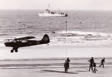 Een Piper Cub vliegt laag over het strand tijdens een demonstratie op de dag van de luchtmacht (zomer 1954).Op zee dobbert een van onze mijnenvegers.