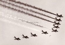 Het stuntteam van onze luchtmacht bij het landen (wielen uit).