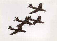 Overvliegen van het stuntteam van onze luchtmacht (Sabre's ?) tijdens de dag van de Luchtmacht in de zomer van 1954.