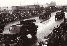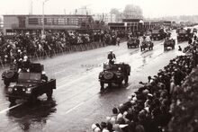 Een afdeling van de Vliegveldverdediging rijdt voorbij de garnaalmijn op de Visserskaai tijdens het defilé van 21-07-1966.