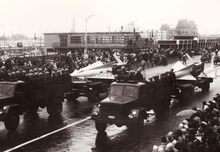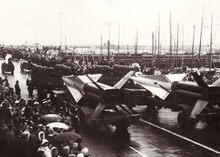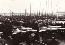 Vrachtwagen van de luchtdoelartillerie met een onbemand vliegtuigje dat de oefendoelen voorttrok,op de Visserskaai tijdens het défile van 21-07-1966. Rechts, het Montgomerydok
