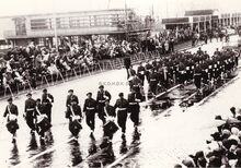 Formaat : 13 x 18 cm. - De muziekkapel van de Zeemacht in de Sint-Peterburgstraat bij het bezoek van veldmaarschalk Montgomery aan onze stad. Links de woning en studio van fotograaf Luc Chatlen. In de deuropening staat mevrouw Chatlen. Rechts de hoek van de Euphrosina Beernaertstraat.