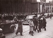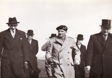 Veldmaarschalk MONTGOMERY in gezelschap van, rechts schepen Emiel VROOME. Links provinciegouverneur Pierre VAN OUTRYVE d'YDEWALLE achteraan met bolhoed schepen Henri EDEBAU.