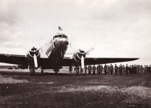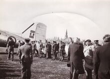 Foto van het vliegtuig, een DC3 (Dakota) waarmee veldmaarschalk MONTGOMERY vertrok van op het vliegveld van Koksijde na zijn bezoek aan Oostende.