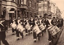 De harmonie van de Gidsen (?) komt voorbij de eretribune en de garnaalmijn tijdens het defilé van 21-07-1966 op de Visserskaai.