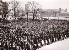 Uitvoering van een gelegenheidscantate op het Vissersplein ter ere van het bezoek van veldmaarschalk MONTGOMERY aan onze stad. "Homage to our Liberators" van Alfons Maes (tekst) en E.D. Boehme (muziek). Let ook op de verdwenen huizenblok tussen de Bonen- en de Cadzandstraat