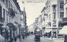 La rue Adolphe Buyl. Rechts het in 1928 opgetrokken nieuwbouw van de Librairie Internationale Boekhandel, de vroegere Librairie Devriendt. De zaak werd tot in 1948 gerund door Frans Devriendt. Vanaf 1948 tot 1980 werd de handel verder uitgebaat door de heer en mevrouw Charles Heilman en Gilberte Devriendt.