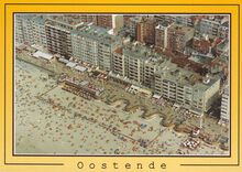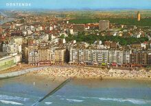 Luchtfoto van de Albert I-promenade en het Groot Strand en zicht op het centrum van de stad. Links, detail van het vierde Kursaal.