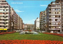 De Leopold II-laan, met op de op de voorgrand "De Zee", of in de volksmond "DikkeΒ Mathilde" van Georges Grard en op de achtergrond, de zuidgevel van het vierde Kursaal