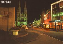 Het Sint Petrus en Paulusplein, met links het vernieuwde oorlogsmonument voor de gesneuvelde Oostendse burgers en militairen tijdens de Eerste en Tweede Wereldoorlog. Rechts, de hostellerie "Old Shakespeare". Op de achtergond, de Sint Petrus en Pauluskerk