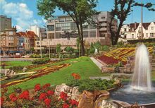 Kruger, NΒ° 933/84. - Oostende - Bloemenuurwerk en Postgebouw. Horloge fleurie et bureau des Postes. Flower-clock and Post-office. Blumenuhr und Postamt. - Vooraan, het bloemenuurwerk in het Leopoldpark en achteraan, het postgebouw in de Hendrik Serruyslaan
