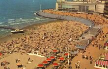 Strandrecreatie op het Groot Strand langs de Albert I-promenade. In de vijftiger jaren kon je met een amfibieboot een tochtje op zee maken. Op het einde, de westgevel van het vierde Kursaal