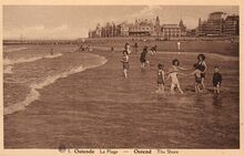 Albert. N° 5. - Ostende - La Plage. Ostend - The Shore. - Pootjebaden langs het groot strand in het Interbellum. Op de achtergrond het derde Kursaal