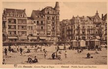 Strandrecreatie op het Groot Strand. Rechts, "Hôtel de l'Océan" en ernaast "Hôtel Continental"