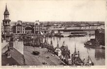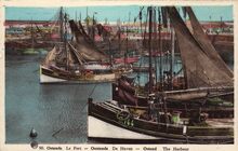 Le port de pêche et la gare maritime. - Gekleurde kaart. - Vissersvaartuigen gemeerd in het eerste handelsdok. Op de achtergrond, het Zeestation. Links, de Vindictivelaan met het Zeevaartcommissariaat, ook de "Pilotage" genoemd.