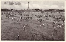 Albert, N° 93. - Ostende - La Plage. Oostende - Het Strand. Ostend - The Sands. - Strandrecreatie op het Klein Strand. De Tweede Wereldoorlog is voorbij, de badkarren zijn verdwenen en op de oosteroever staat de vierde vuurtoren, "Lange Nelle".