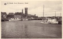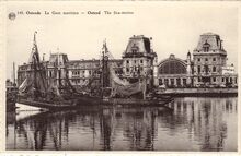 Ostende. Bassin Montgomery. Albert n° 142. Titel van prentkaart onjuist. Het eerste handelsdok. Door de bouw van de Mercatorsluizen, begin de zeventiger jaren, veranderen de handelsdokken in een jachthaven, de Mercatorjachthaven, nu Mercator Marina. Op de achtergrond het tweede sproowegstation (Oostende-Stad)