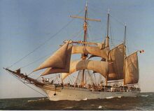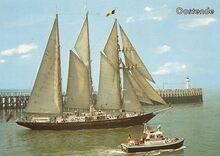 Groeten uit Oostende. AVM A. 129. Brits zeilschip verlaat de haven van Oostende, begeleidt door een patrouillevaartuig van de politie. Op de achtergrond het weststaketsel
