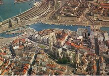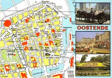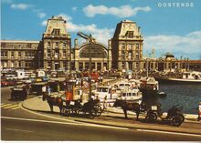 Panorama van de haven. Rechts beneden, de wijk Hazegras met het eerste en tweede handelsdok en het tweede spoorwegstations. Wat verder, aan het begin van het eerste handelsdok, het Zeestation. De havengeul met op de achtergrond, de oosteroever. Links, een deel van Oostende centrum, met de Sint Petrus en Pauluskerk. De Vindictivelaan is links langs de handelsdokken gelegen. De oude vismijn, of "De Cirk", langs de Visserskaai en het Schuildok