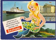 De Leopold II-laan, met op de op de voorgrand "De Zee", of in de volksmond "Dikke Mathilde" van Georges Grard en op de achtergrond, de zuidgevel van het vierde Kursaal