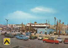 AVM, N° ZP. 28. De carferry "Prince Laurent" in de havengeul van Oostende. Zomerse drukte op het "Klein Strand". Veel jachten in het Montgomerydok.