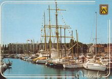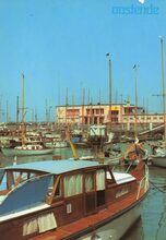 Pluscolor, N° OS 17. - Oostende - Haven. Port. Hafen. - Op de achtergrond het clubhuis van de "North Sea Yacht Club", palend aan de monding van de jachthaven aan de Montgomerykaai. Het clubhuis werd gebouwd in de periode 1952-1956 naar het ontwerp van architect J. Maes en ingenieur architect W. Marchal, dit ter vervanging van het gelijknamige houten clubhuis uit het tweede kwart van de 20ste eeuw op dezelfde plaats