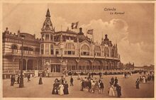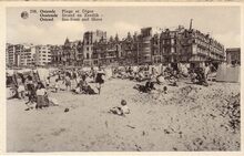 Strandrecreatie op het Groot Strand en zicht op de westgevel van het vierde Kursaal gelegen langs de Albert I-promenade (Petit Nice)