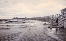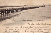 Ostende, l'Estacade. - Bijgekleurd. - Het Weststaketsel met op het einde het café-paviljoen. Je kon er genieten van een drankje en de gezonde zeelucht. Populair was ook, met een kruisnet een krabbetje of een visje te vangen. Een wandeling op het Weststaketsel was populair bij de toerist en de Oostendenaar.
