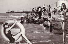Het Groot Strand met de traditionele badkarren. Op de achtergrond, het derde Kursaal