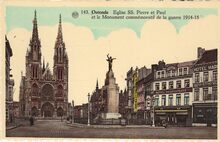 Albert, N° 143. - Ostende - Eglise SS.Pierre et Paul et le monument commémoratif de la guerre 1914-1918. - Bijgekleurde kaart. - Vooraan, het monument voor de Oostendse slachtoffers van de Eerste Wereldoorlog.