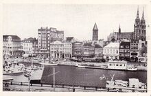 Gare maritime et bateaux de pêche. - Vissersvaartuigen gemeerd in het Montgomerydok. Rechts, de Garnaalmijn langs de Visserskaai. Op de achtergrond, het Zeestation en de gebouwen van het Bestuur van het Zeewezen