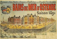 Afdruk van affiche Chemin de fer du Nord de la France, de l'Etat Belge & de la Flandre Occidentale. - De Zeedijk gezien, links vanaf de eerste vuurtoren (de Vlaggestok), richting het tweede Kursaal. Vooraan, het Groot Strand. Oostende in de Belle Epoque.