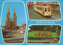 AVM A. 163. - Het Sint Petrus en Paulusplein, met vooraan het vernieuwd monument voor de gesneuvelde Oostendse burgers en militairen tijdens de Eerste en Tweede Wereldoorlog. Rechts, het Strand Hotel, Hotel Maritime en hostellerie Old Shakespeare. Op de achtergrond, de Sint Petrus en Pauluskerk.