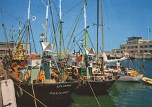 Pluscolor, N° OS 16. - We zien het Montgomerydok vanaf de noordzijde waar de jachten en pleziervaartuigen gemeerd liggen nabij de Royal North Sea Yacht Club. Een loodsboot. Kustvissersvaartuigen gemeerd nabij de garnaalmijn. Rechts, de Visserskaai