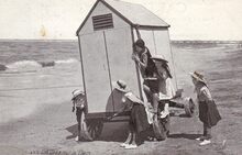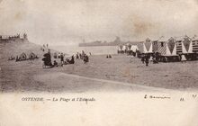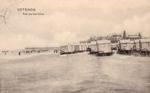 Het Groot Strand met de traditionele badkarren. Op de achtergrond, het derde Kursaal