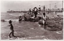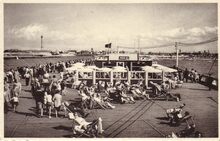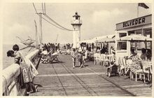 Ostende, l'Estacade. - Bijgekleurd. - Het Weststaketsel met op het einde het café-paviljoen. Je kon er genieten van een drankje en de gezonde zeelucht. Populair was ook, met een kruisnet een krabbetje of een visje te vangen. Een wandeling op het Weststaketsel was populair bij de toerist en de Oostendenaar.
