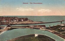 Ostende - Vue panoramique. - Bijgekleurde kaart. - Vooraan, de Leopoldspuikom en -sluis. De havengeul en op de achtergrond, het Klein Strand en de Zeedijk.