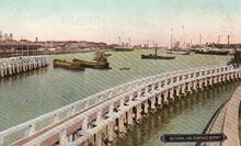 Leys. - Gedeelte van de Vindictivelaan tussen de Kapellestraat (links), de huidige Dekenijstraat (midden) en de Zuidstraat (rechts). Het grote gebouw is Hotel Stella Maris. Vooraan, het eerste handelsdok met enkele oorlogsschepen en centraal het oesterschip van Zoete. Op de achtergrond, de Peperbusse, de toren van de door brand vernielde Sint Pieterskerk en rechts de Sint Petrus en Pauluskerk.